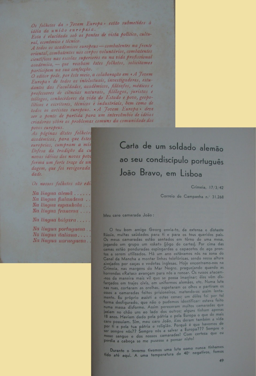 A carta de um soldado alemão ao seu “condiscípulo” português, foi publicada na edição de Junho/Julho de 1942 da revista “A Jovem Europa”, uma publicação com sede em Berlim, e editada em doze línguas.